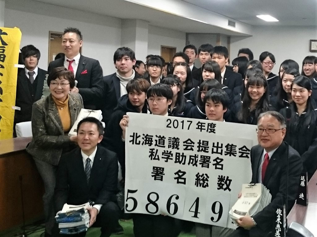 「公私間格差の是正を求める請願署名」を約40名もの高校生が道議会に提出しにやってきました。両親や兄妹に私学に通うことの心苦しさなどが訴えられました。子ども達が公私立の区別無く、夢に向かって進むことが出来るよう尽力して参ります。