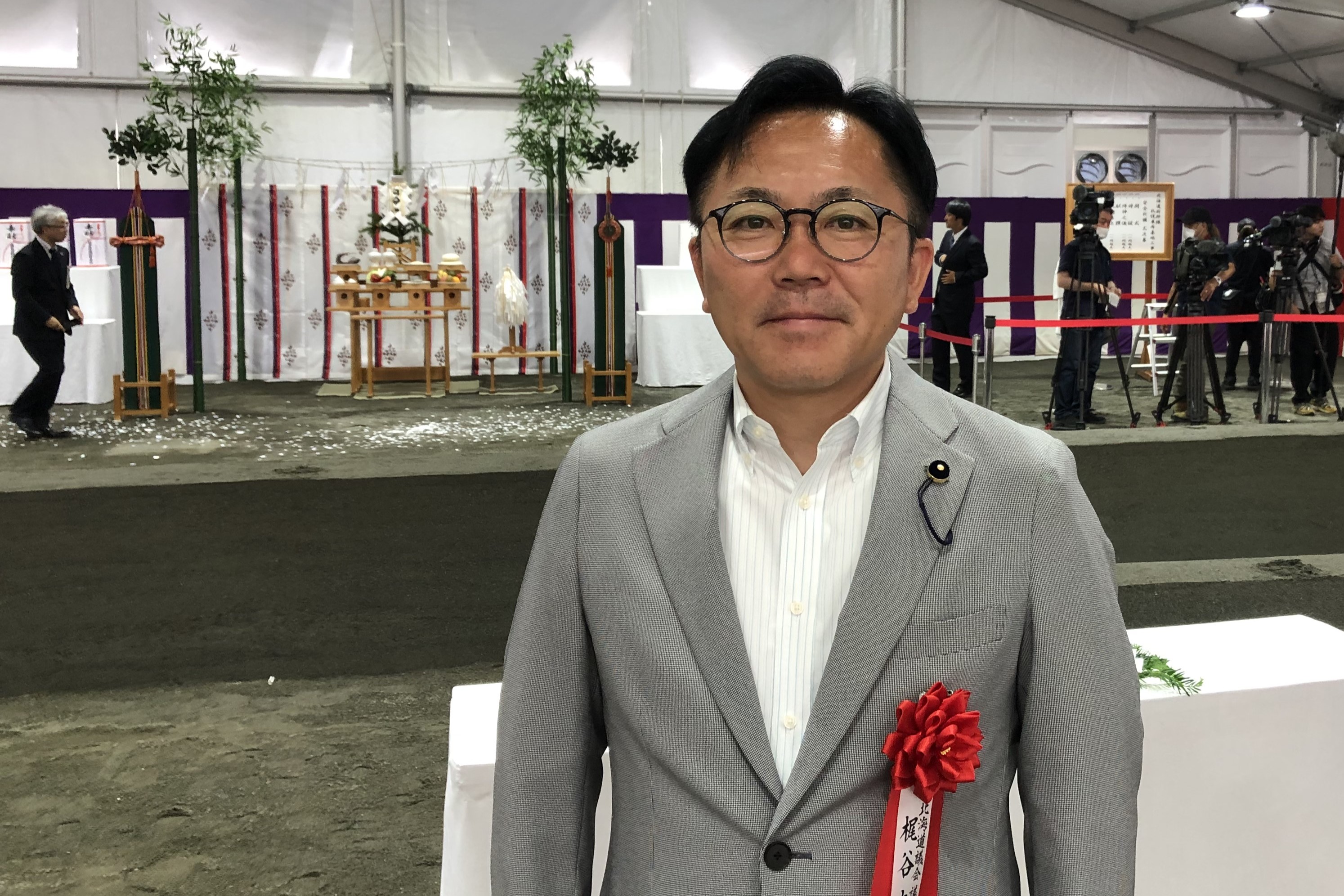 新幹線の札幌延伸に合わせてJR札幌駅の近くに設けられる車両基地の起工式に出席しました。関係者約100人が出席し、くわ入れや玉串奉奠を行い工事の安全を祈願しました。